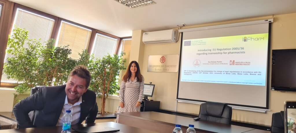 As a part of Erasmus+ IQPharm WP activity 2.6. Herzegovina/IQPharm WP 2.6 Developing of the Recommendation for change of legal regulation(s) in accordance with EU Regulations 2005/36, the meeting was held on October 5th and 6th, 2023 at the Faculty of Medicine, University of Banja Luka, Banja Luka, Bosnia and Herzegovina. This activity gathered representatives from Ministry of Health and Social Welfare of the Republic of Srpska, Pharmaceutical Chamber of the Republic of Srpska, Pharmaceutical Society of the Republic of Srpska and also representatives from IQPharm partner universities. IQPharm project partners presented the pecularities of pharmaceutical practices conducting at each university and specificities of current legal regulations covering this field. Also, representatives from the University of Split shared their experiences regarding the challanges faced during implementation of EU Regulations 2005/36 and 2013/55 in Croatia. After intensive discussion of all participants several conclusions were made that will help universities from Bosnia and Herzegovina to make future steps and provide concrete suggestions and recommendations for changing current legislation in accordance with EU Regulations 2005/36 and 2013/55 that will be of great importance for the final implementation of the project’s goals. The next meeting covering this topic is scheduled for 9-10 October in Mostar.